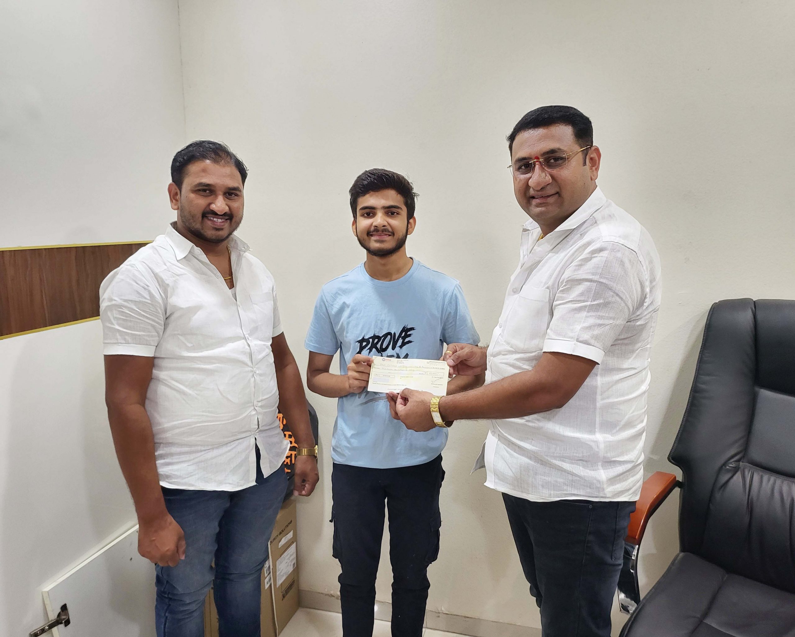 दिनांक १५/०५/२०२३ रोजी सामाजिक बांधिलकी म्हणून गरजू विद्यार्थ्यांना आर्थिक अडचणीविना शिक्षण पूर्ण करता यावे या उद्देशाने शाऊ फाउंडेशन तर्फे कु. वरद विनोद पाटील या विद्यार्थ्याची इंजीनियरिंगची पुर्ण शैक्षणिक फी चा चेक सुपूर्द करताना.