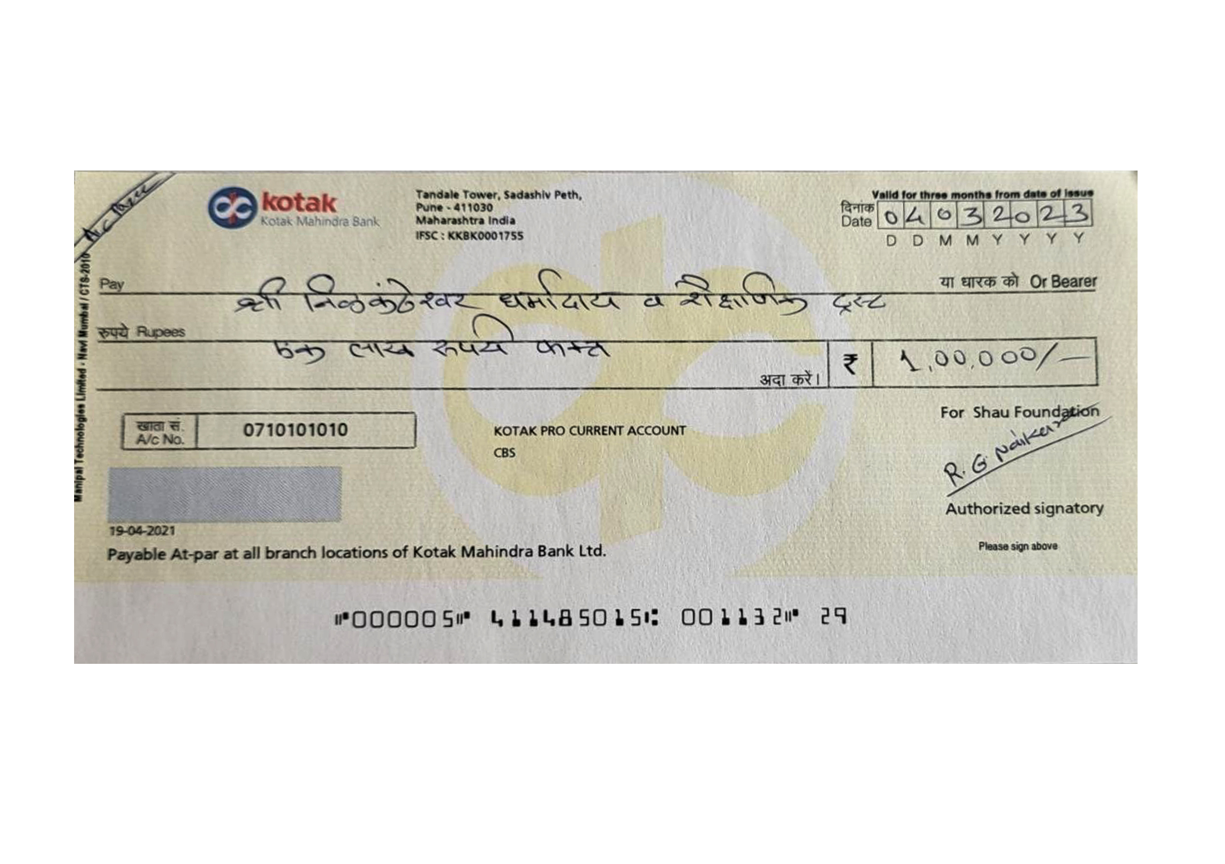 दिनांक ०४/०३/२०२३ रोजी श्री निळकंठेश्वर धर्मदाय व शैक्षणिक ट्रस्टच्या सामाजिक उपक्रमांसाठी सहकार्य म्हणून शाऊ फाउंडेशन तर्फे १ लाख रुपयांच्या देणगीचा चेक ट्रस्टचे मॅनेजर सोमनाथ भाऊ गुंजाळ यांच्याकडे सुपूर्द करण्यात आला.